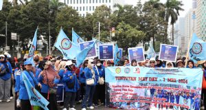 Jakarta – Ribuan buruh memadati kawasan Patung Kuda Silang Monas, Gambir, Jakarta Pusat dalam rangka memperingati Hari Buruh Internasional atau ...
